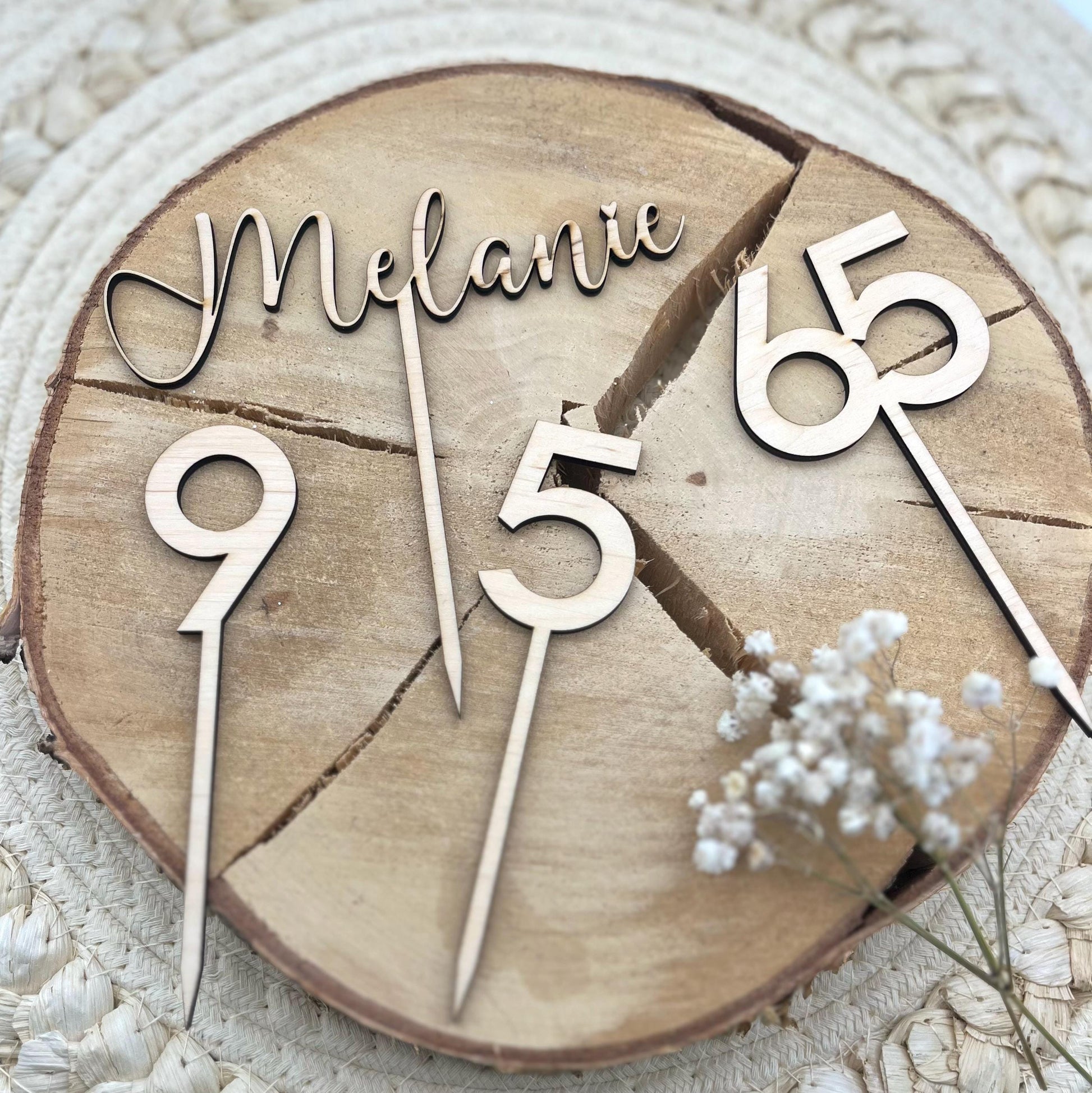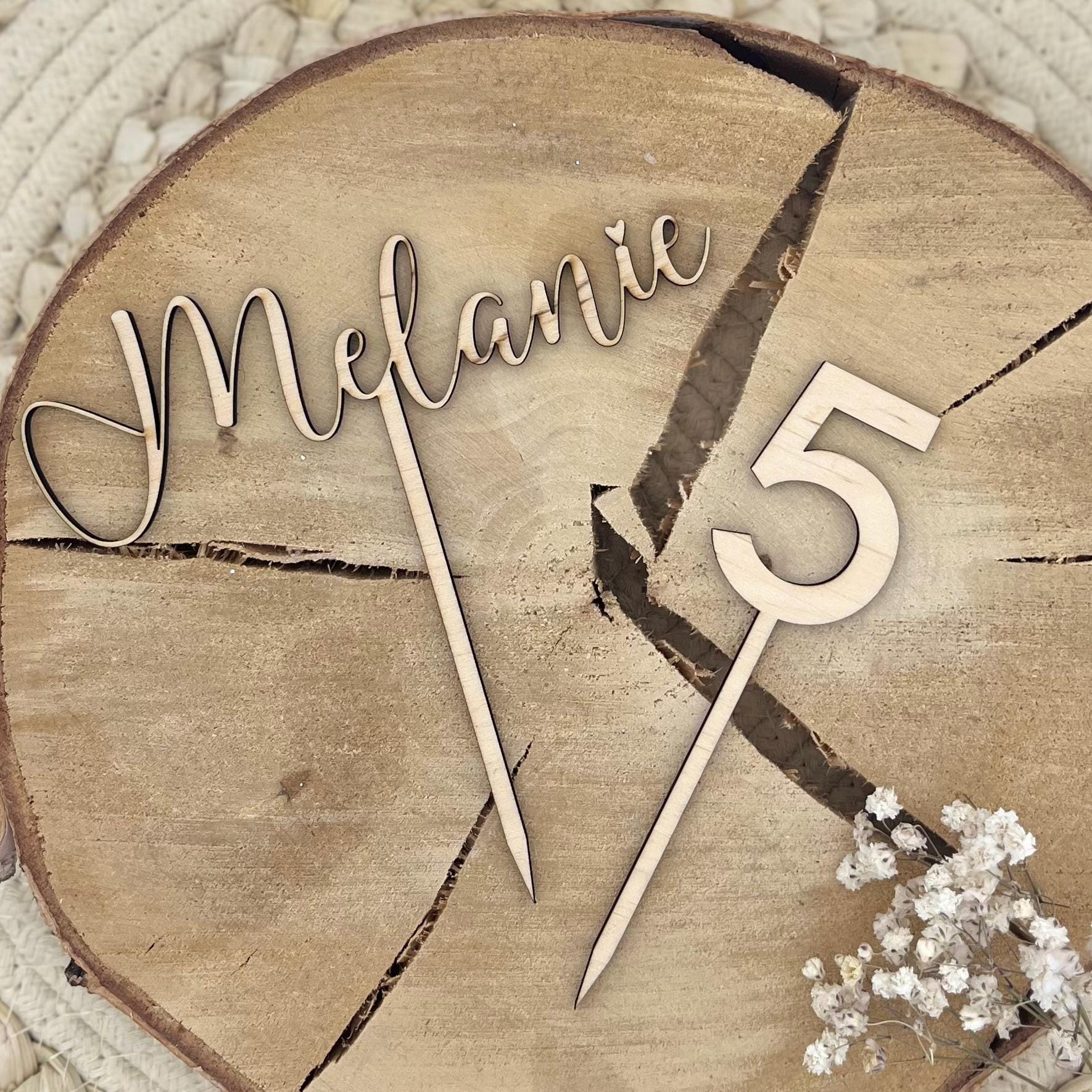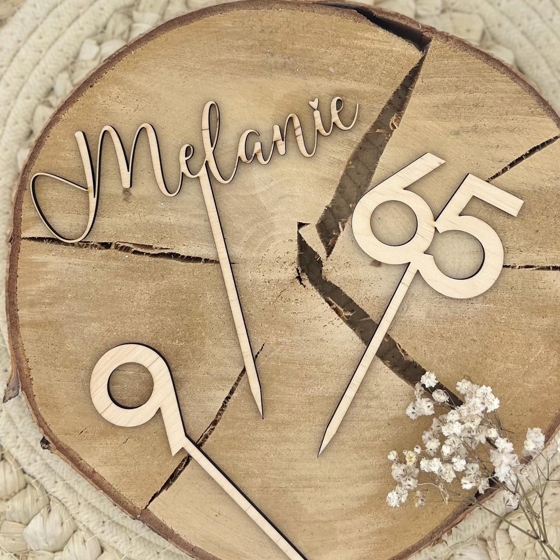 Diese personalisierten Caketopper - Cake Topper aus Holz – aus hochwertigem 4 mm Birkensperrholz sind die perfekte Tortendekoration für Geburtstage, Taufen, Jubiläen oder andere Feierlichkeiten. Du kannst zwischen mehreren Varianten wählen und deinen Topper individuell gestalten – in Natur oder Farbe sowie mit deiner Wunschschriftart.