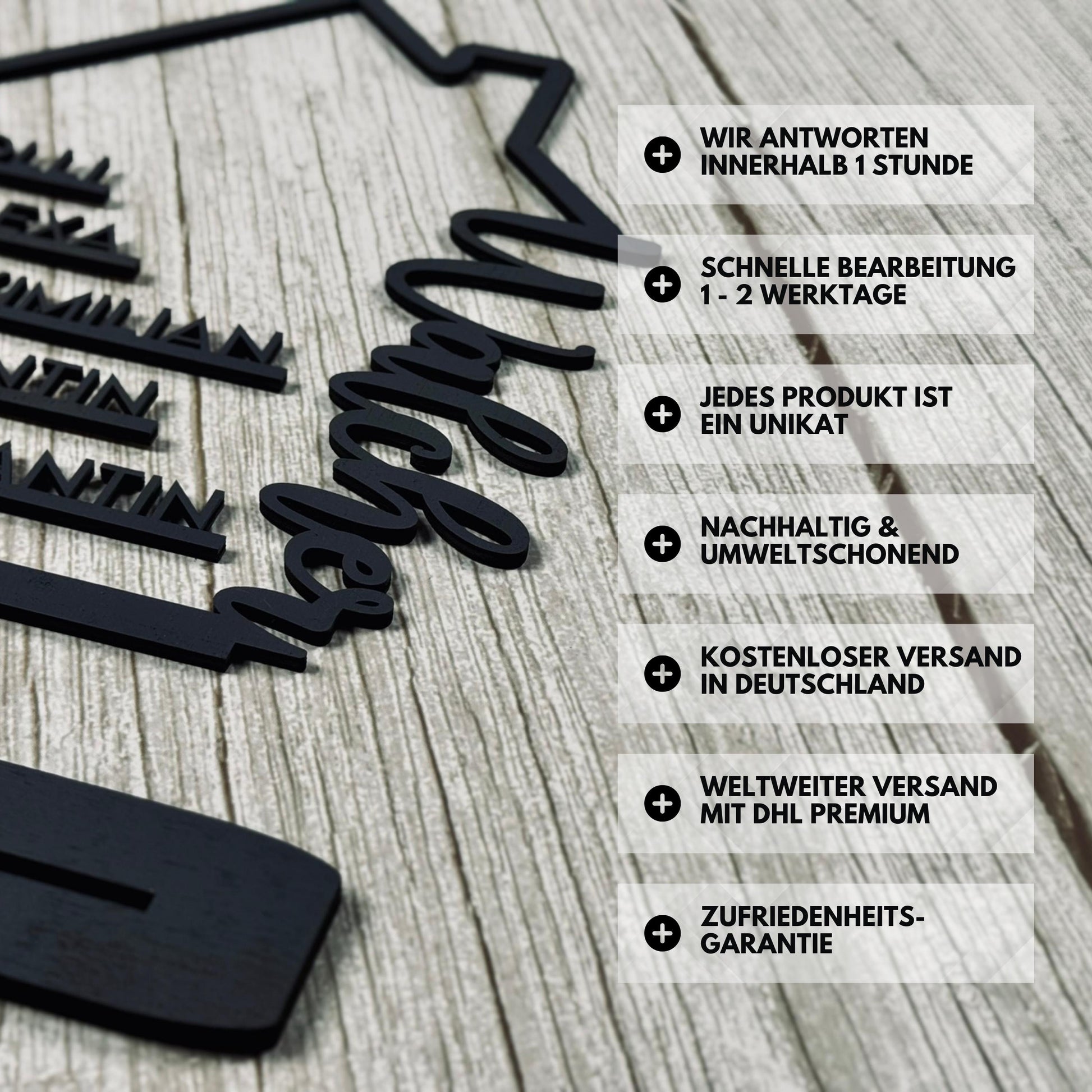 Unser personalisiertes Familienschild ist die perfekte Kombination aus Qualität, Handarbeit und Design – ein Geschenk, das begeistert und lange Freude bereitet.
