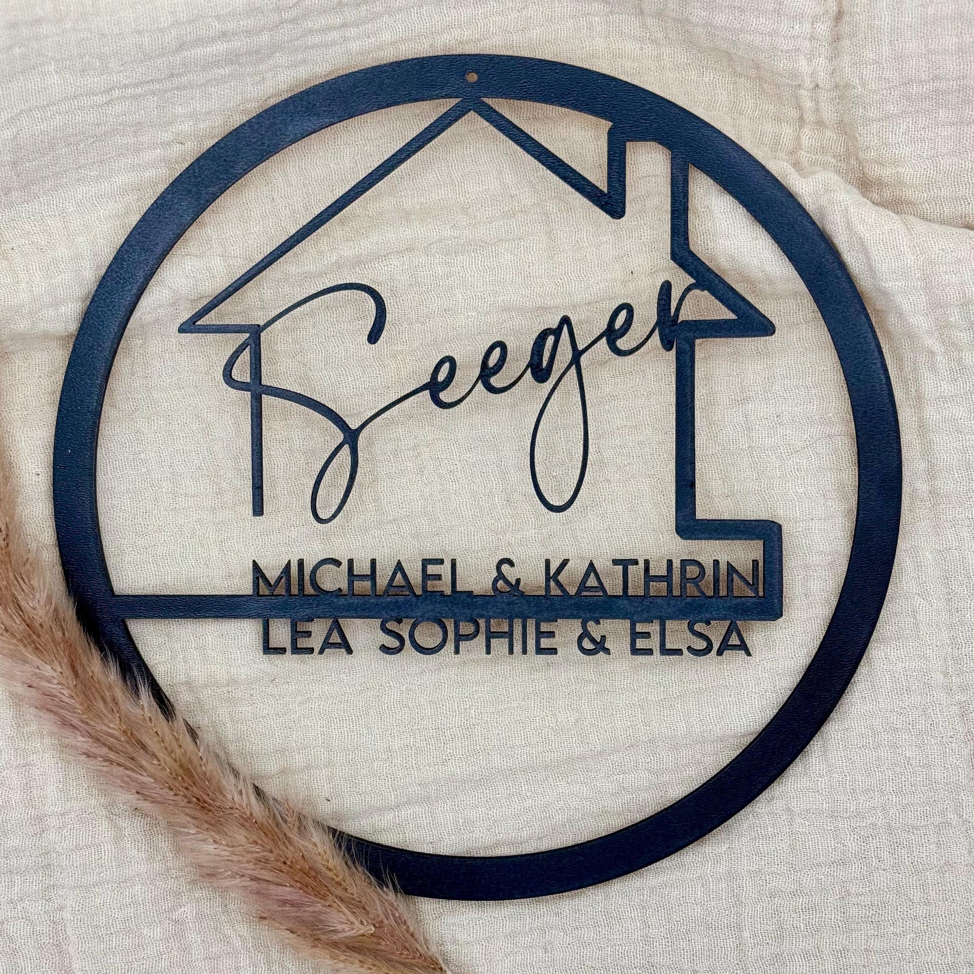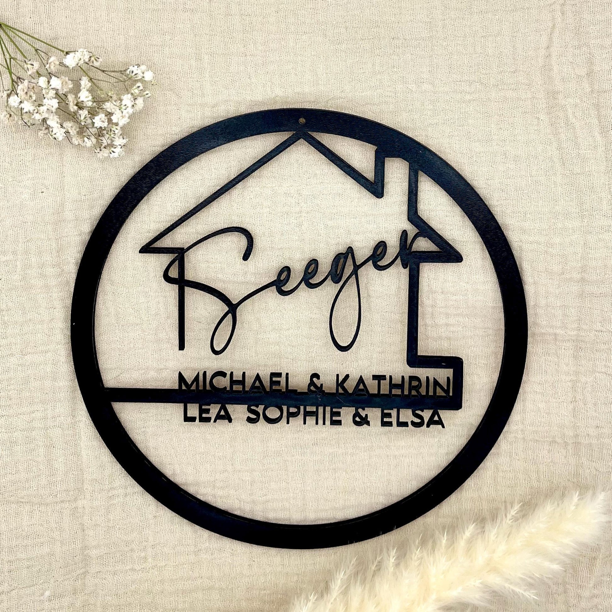 • Design: Runde Form mit Haussymbol, Nachname & Vornamen