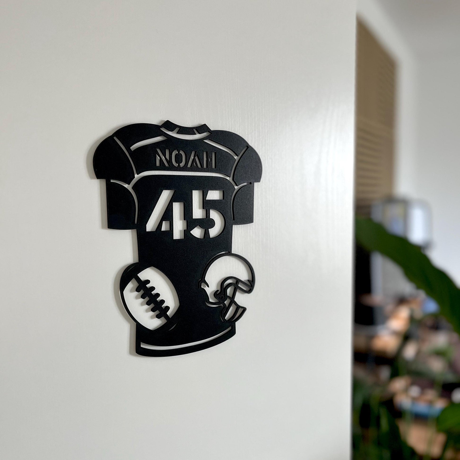 Ein einzigartiges Geschenk für kleine und große Football-Fans: Unser Namensschild in Trikot-Form mit Ball und Helm wird individuell mit deinem Wunsch-Namen und einer frei wählbaren Rückennummer gefertigt. So wird jedes Schild zum sportlichen Highlight im Kinderzimmer, an der Tür oder im Regal.