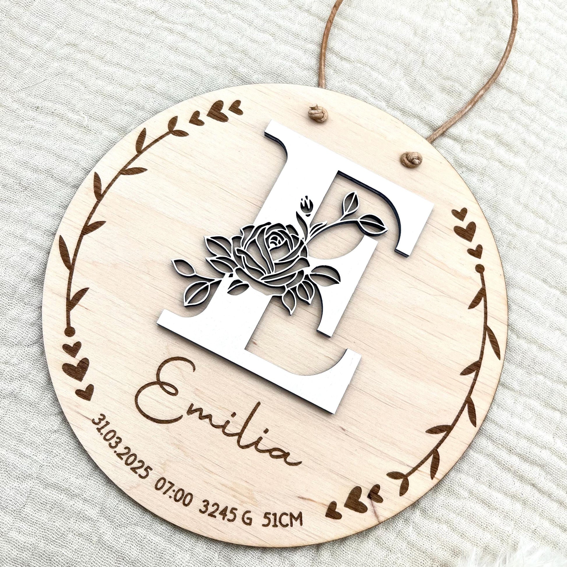 Unser Geburtsschild aus FSC-Birkenholz mit 3D-Monogramm und Rose wird mit Name, Geburts- oder Taufdatum, Uhrzeit, Gewicht & Größe graviert. Ein individuelles Erinnerungsstück und dekoratives Highlight fürs Kinderzimmer.