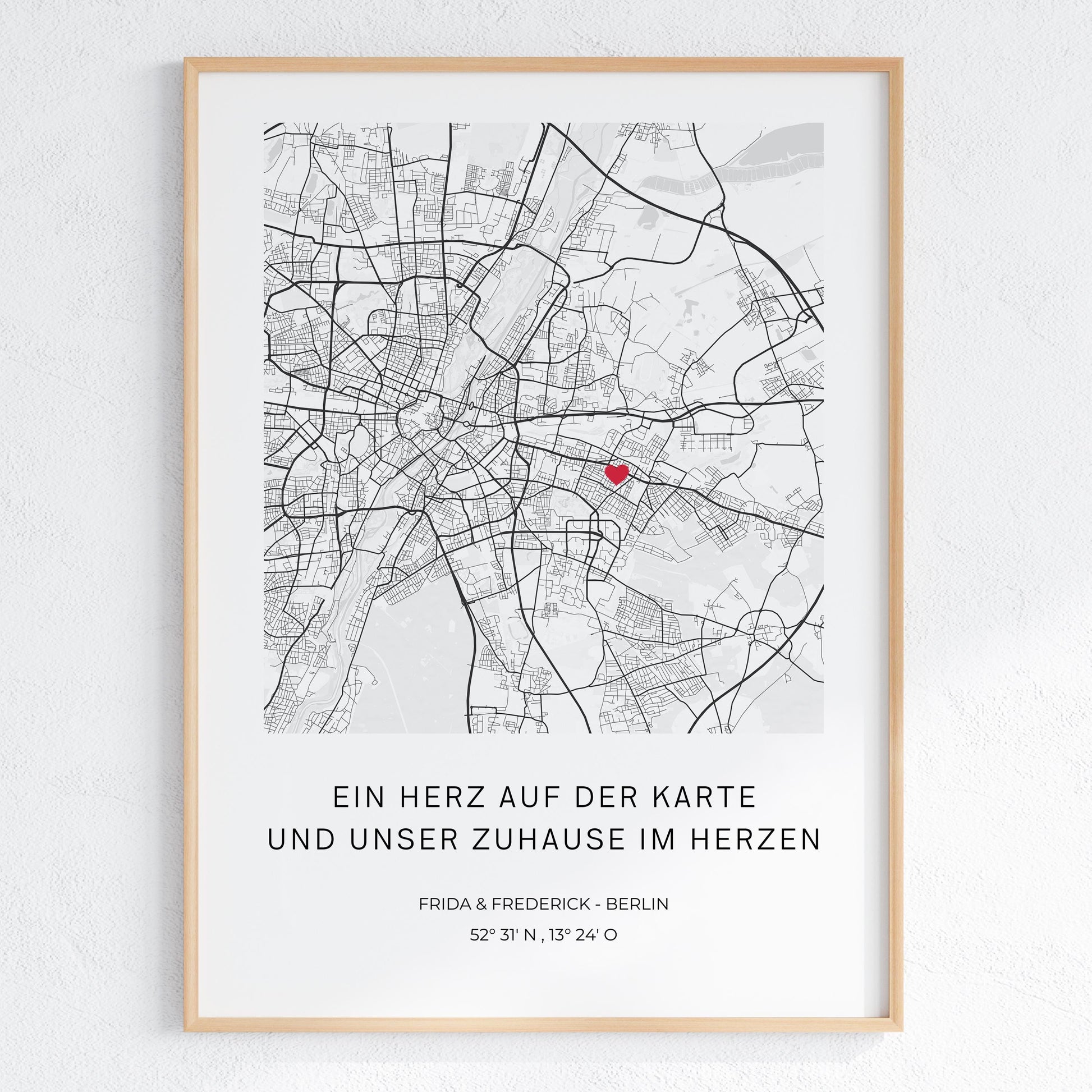 Unser Stadtplan-Poster mit Herzsymbol zeigt den Ort eures Kennenlernens, Zuhauses oder besonderen Moments. Mit Namen, Wunschtext und Koordinaten personalisiert, wird es zu einem stilvollen Erinnerungsstück.