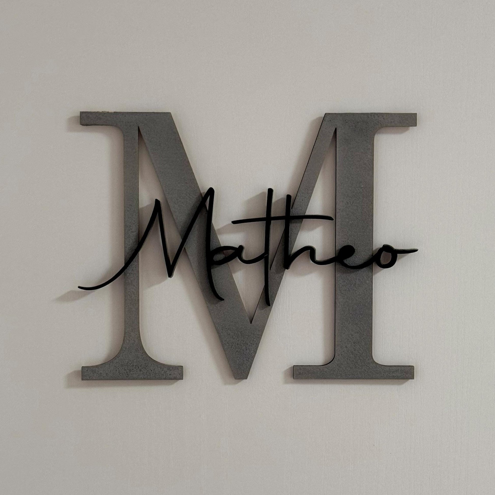 Mit diesem stilvollen Schriftzug aus Holz ziehst du alle Blicke auf dich: Der erste Buchstabe des Vornamens wird groß und markant im Hintergrund dargestellt, während der komplette Name im Vordergrund für den persönlichen Touch sorgt.
