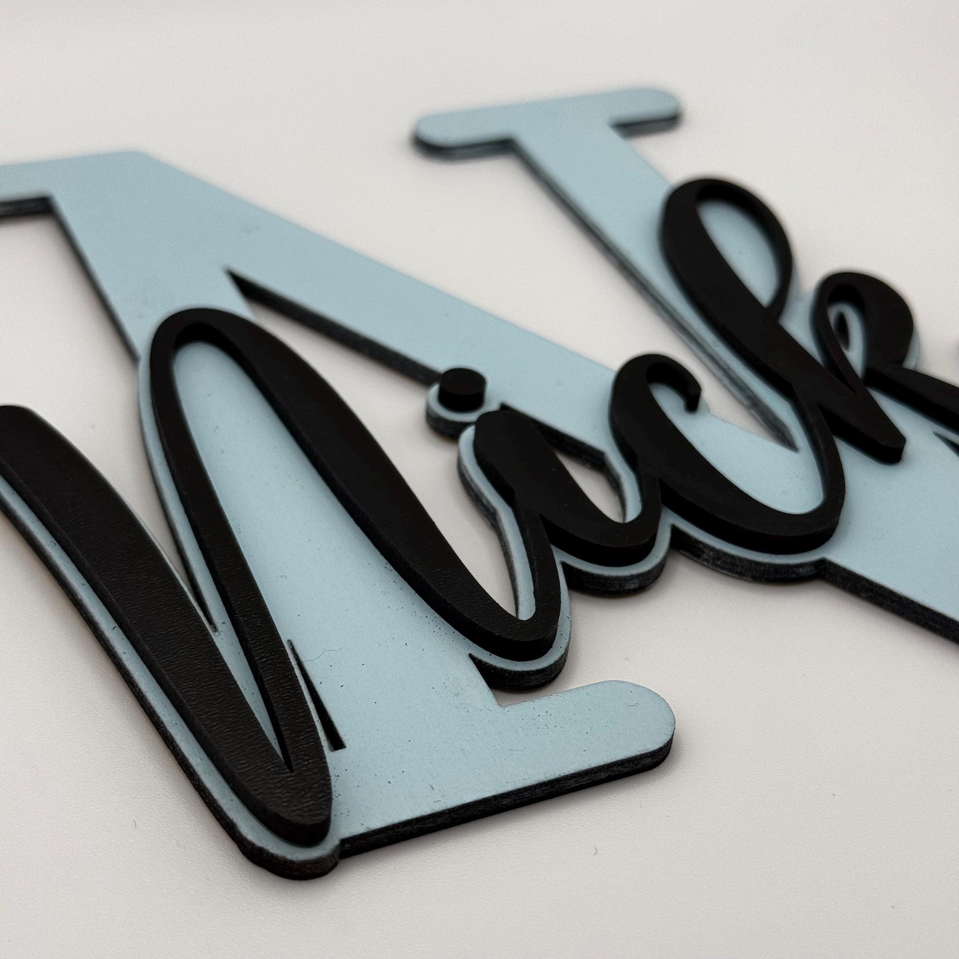 Unser Namensschild mit 3D-Effekt bringt Kinderaugen zum Strahlen. Der Anfangsbuchstabe bildet den Hintergrund, der vollständige Name liegt modern darüber – individuell gestaltet in deinen Wunschfarben.