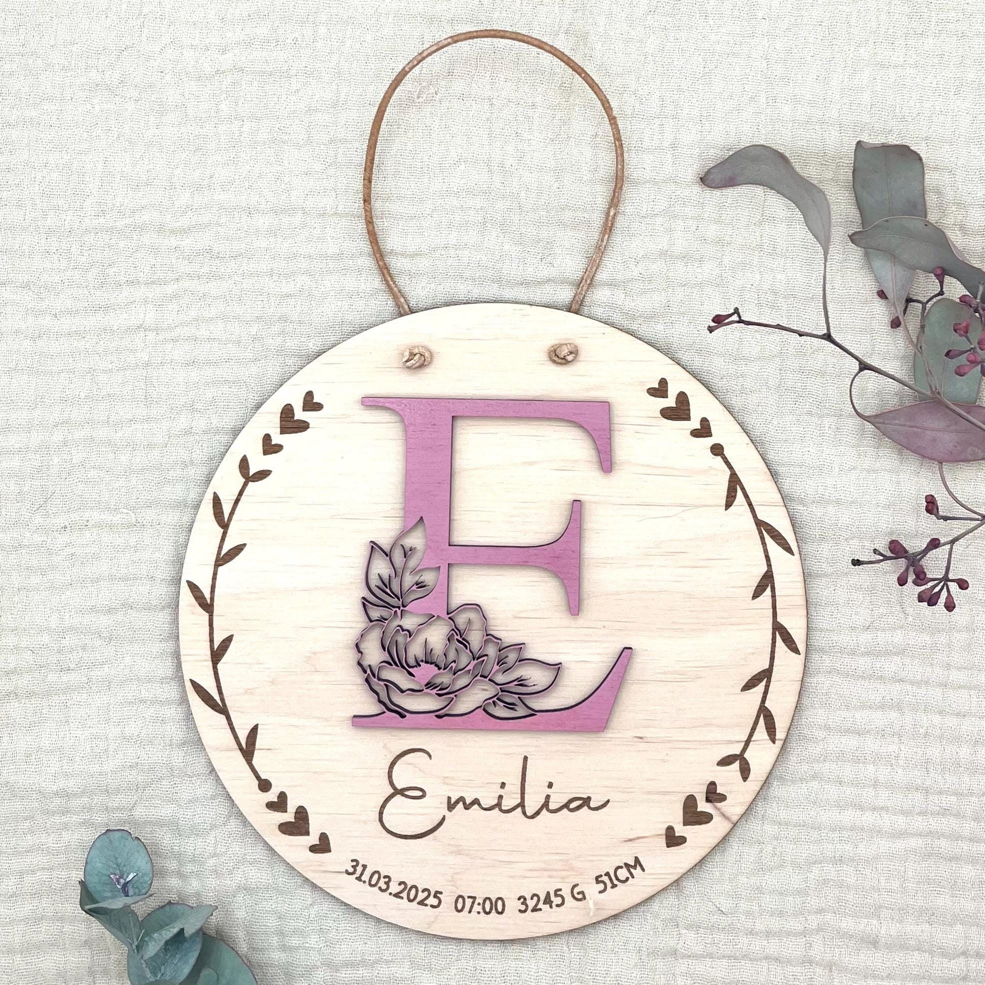 Das Design kombiniert ein elegantes 3D-Monogramm mit floraler Rose, den Namen des Kindes sowie die wichtigsten Geburtsdaten – Datum, Uhrzeit, Gewicht und Größe. Jedes Schild wird liebevoll gefertigt und ist durch die natürliche Maserung des Holzes ein Unikat.