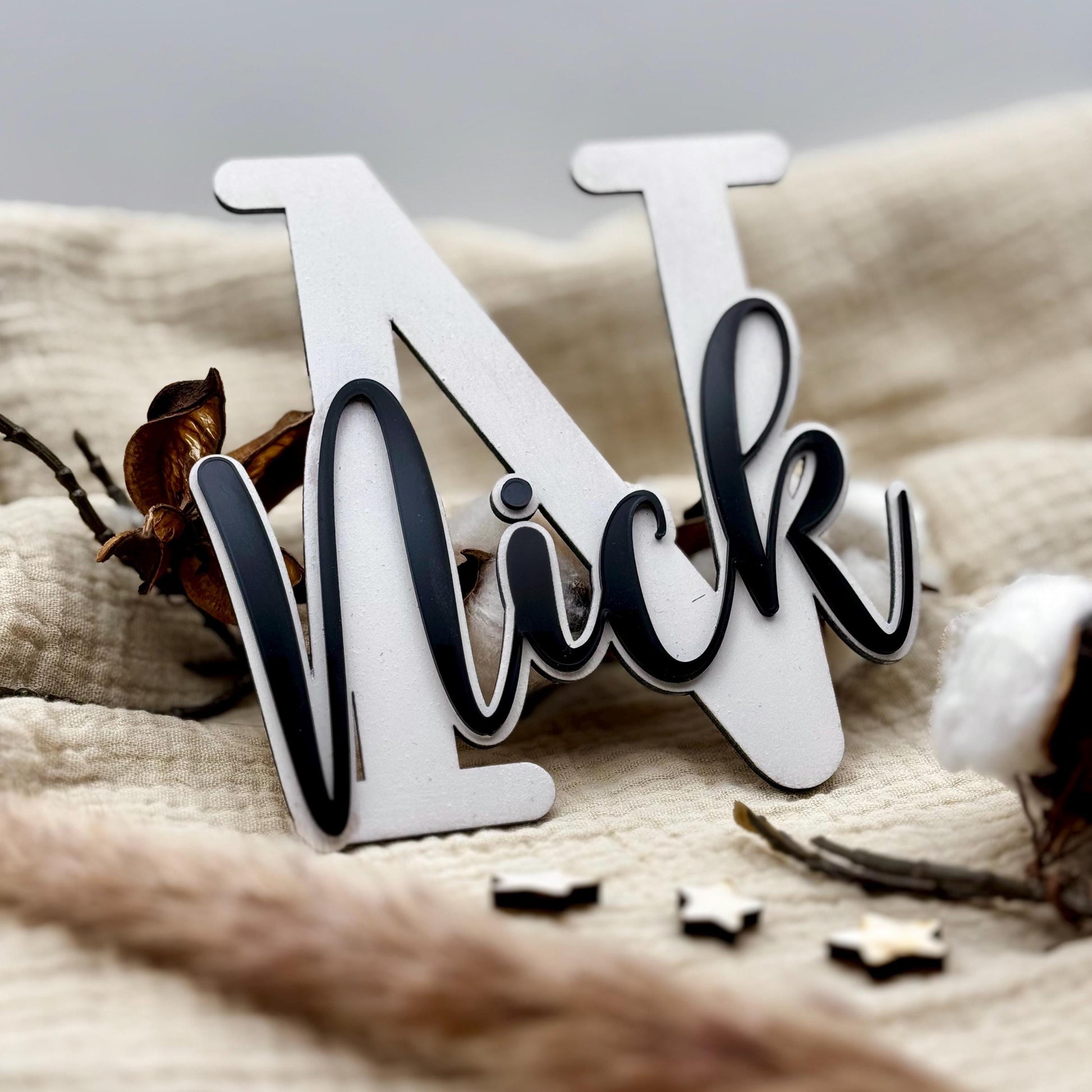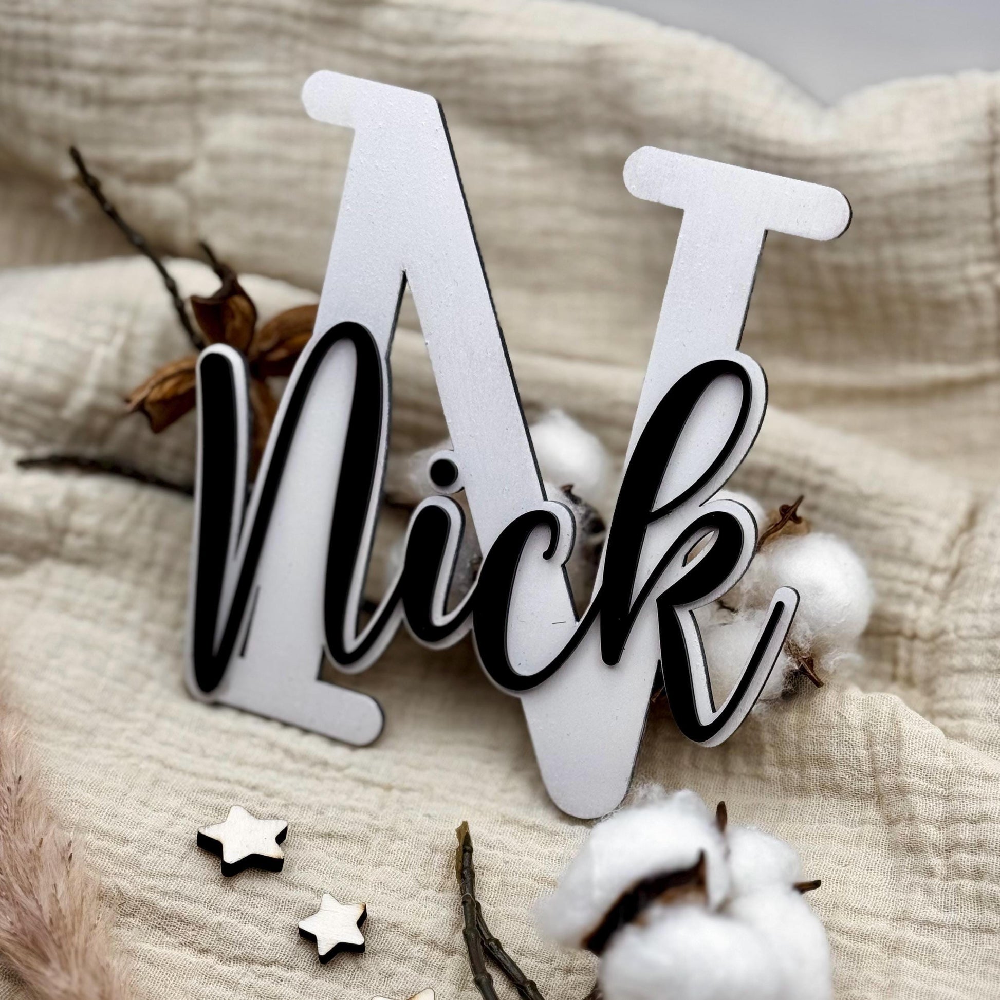 Groß denken, groß gestalten: Dieses personalisierte Namensschild aus Holz mit starkem 3D-Effekt bringt nicht nur den Namen deines Kindes zur Geltung, sondern wird zum echten Highlight im Raum. Der erste Buchstabe bildet den Hintergrund, der vollständige Name liegt modern & leicht darüber – für einen Look, der beeindruckt.