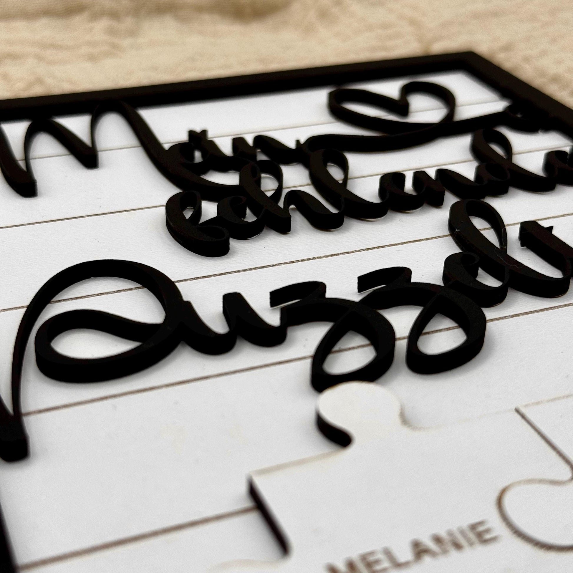 Unser personalisiertes Puzzle aus edlem weißen Holz ist mehr als nur ein Geschenk – es ist ein Symbol für Zusammenhalt und Liebe. Jedes Puzzle wird individuell gestaltet, mit den Vornamen der Familie oder des Paares auf den ineinander passenden Teilen. Ein schwarz-matter Rahmen umgibt das Puzzle und sorgt für einen eleganten Kontrast, während der integrierte Schriftzug in 3D-Optik das Design abrundet und Tiefe verleiht.