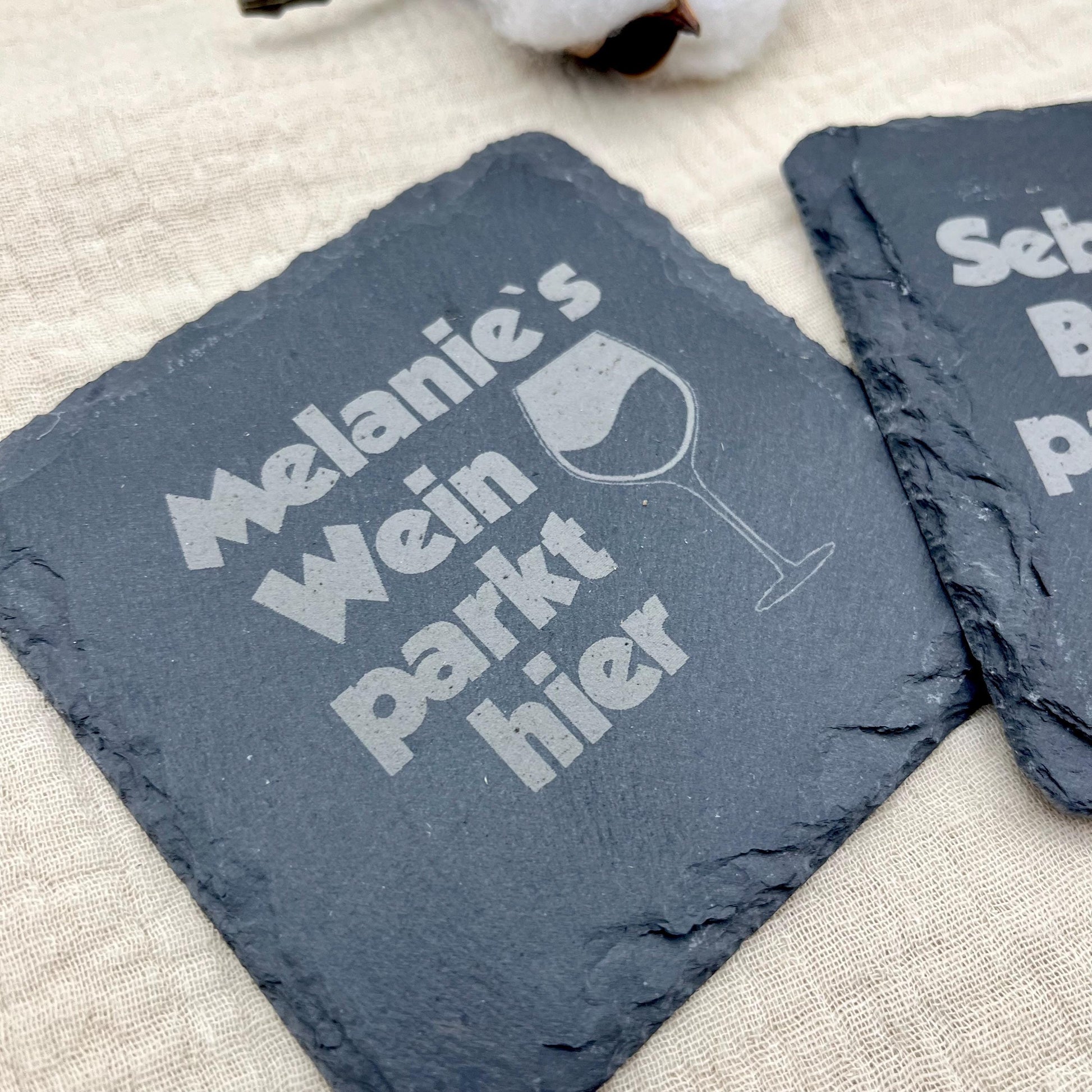 Diese hochwertigen Schiefer-Untersetzer bringen Stil und Persönlichkeit auf jeden Tisch. Personalisiert mit deinem Namen, deinem Lieblingsgetränk und einem Spruch deiner Wahl, wird jeder Untersetzer zu einem einzigartigen Highlight. Perfekt als Geschenk für Hochzeiten, Jubiläen, Geburtstage oder als Party-Gadget!