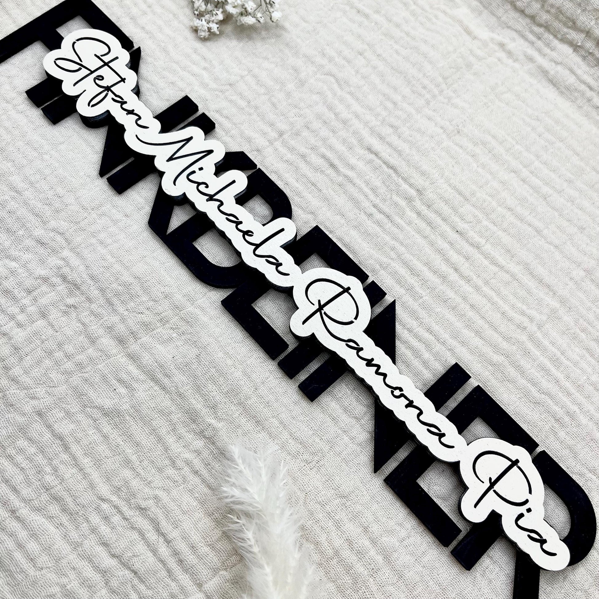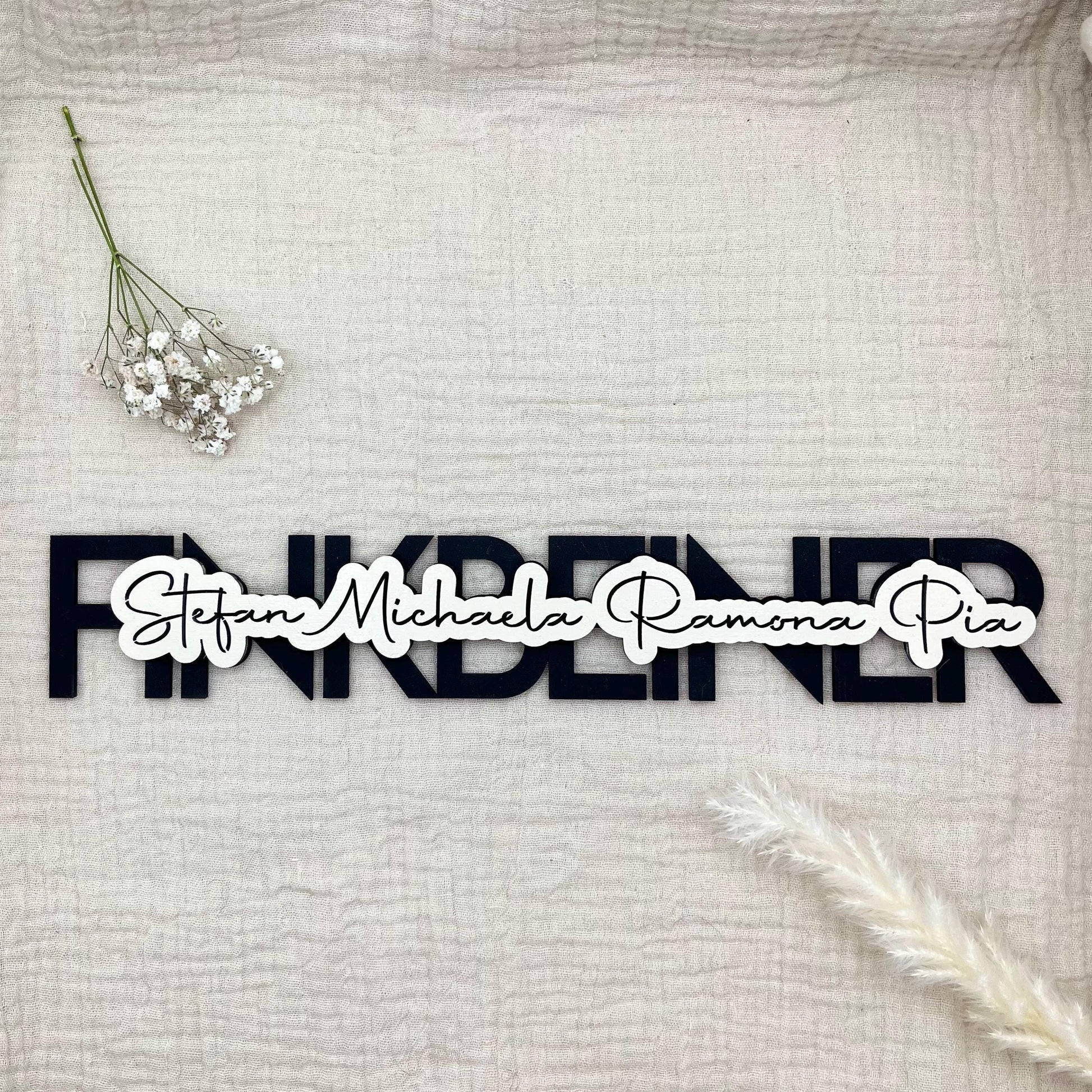 Dieses personalisierte Familienschild kombiniert den Familiennamen im Hintergrund mit einer modernen 3D-Optik der Vornamen im Vordergrund. Gefertigt aus hochwertigem FSC-Birkenholz und gestaltet in den Farben deiner Wahl, wird es zum einzigartigen Blickfang für Haustür, Eingangsbereich oder Wohnzimmer.