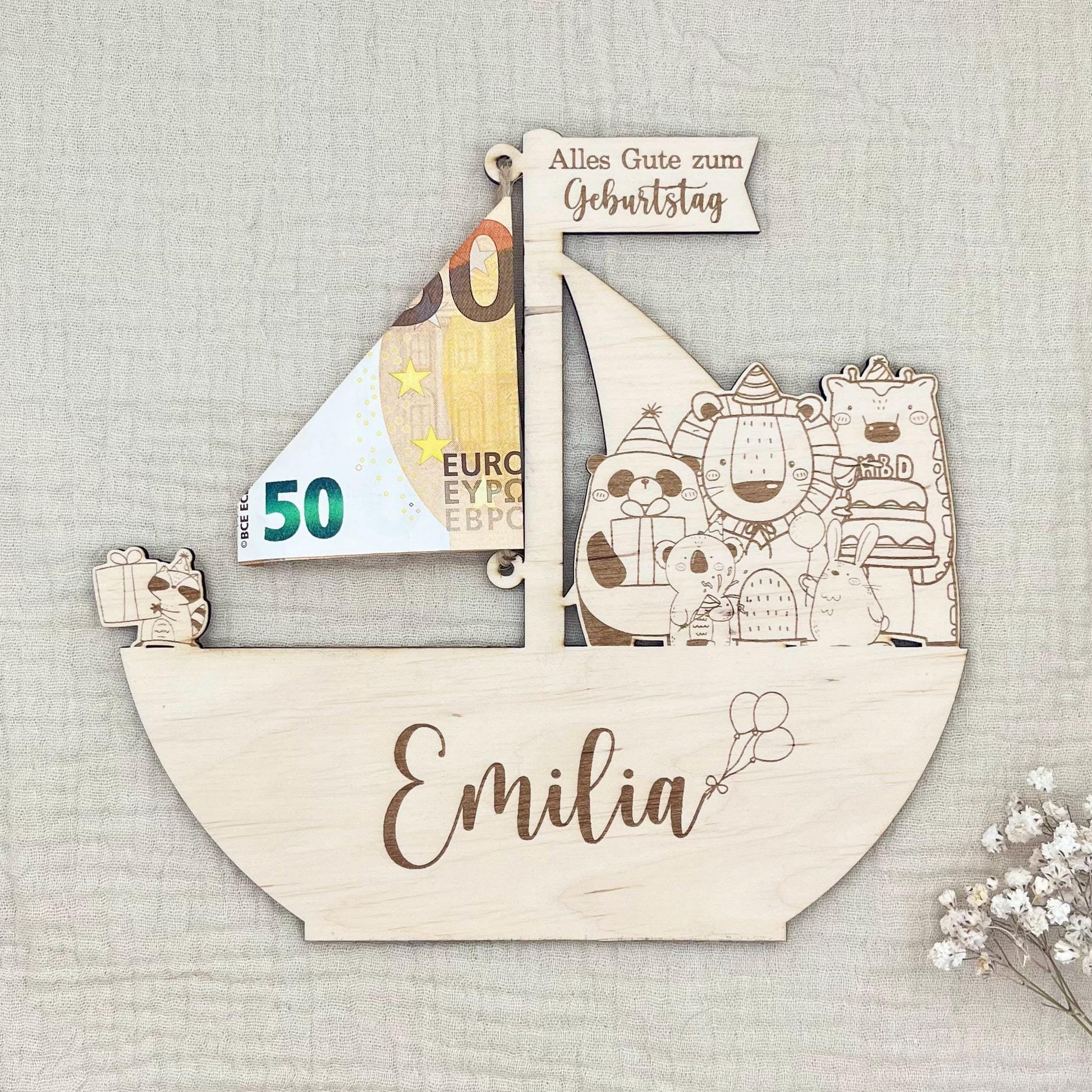 ⛵ Personalisiertes Geldgeschenk Geburtstag Taufe, Kommunion, Konfirmation personalisiert mit Namen & Anlass – Geld verschenken Geschenkidee Schiff aus Holz – mit Wunschtext & Namen