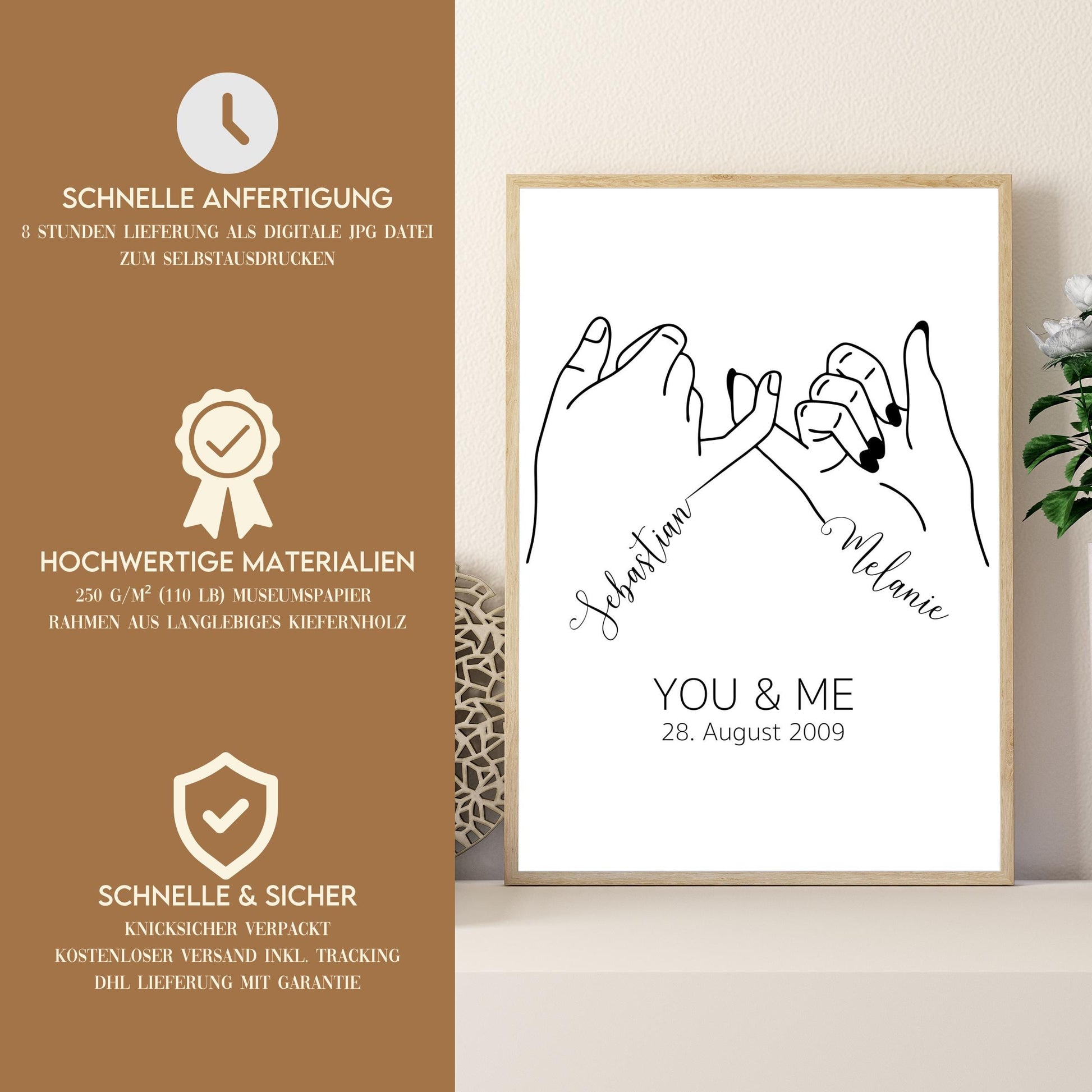 Unser personalisiertes Hand in Hand Poster für Paare auf hochwertigem Museumspapier ist eine liebevolle Art, besondere Momente festzuhalten. Mit dem einzigartigen Hand-in-Hand-Motiv und der Möglichkeit, Namen und ein bedeutendes Datum zu integrieren, ist es das ideale Geschenk für Jahrestage, Hochzeiten, Verlobungen, Geburtstage oder einfach als Erinnerung an unvergessliche Momente.