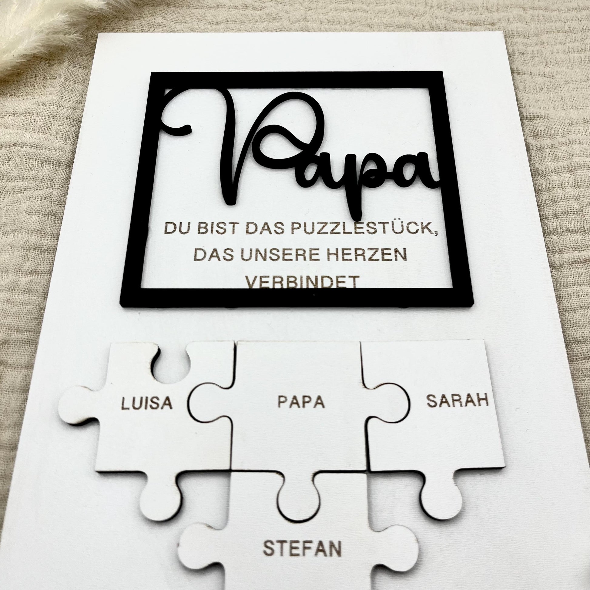 In der Mitte steht „Papa“, umgeben von den Namen seiner Liebsten – als Puzzle, das sinnbildlich für eure Verbundenheit steht.