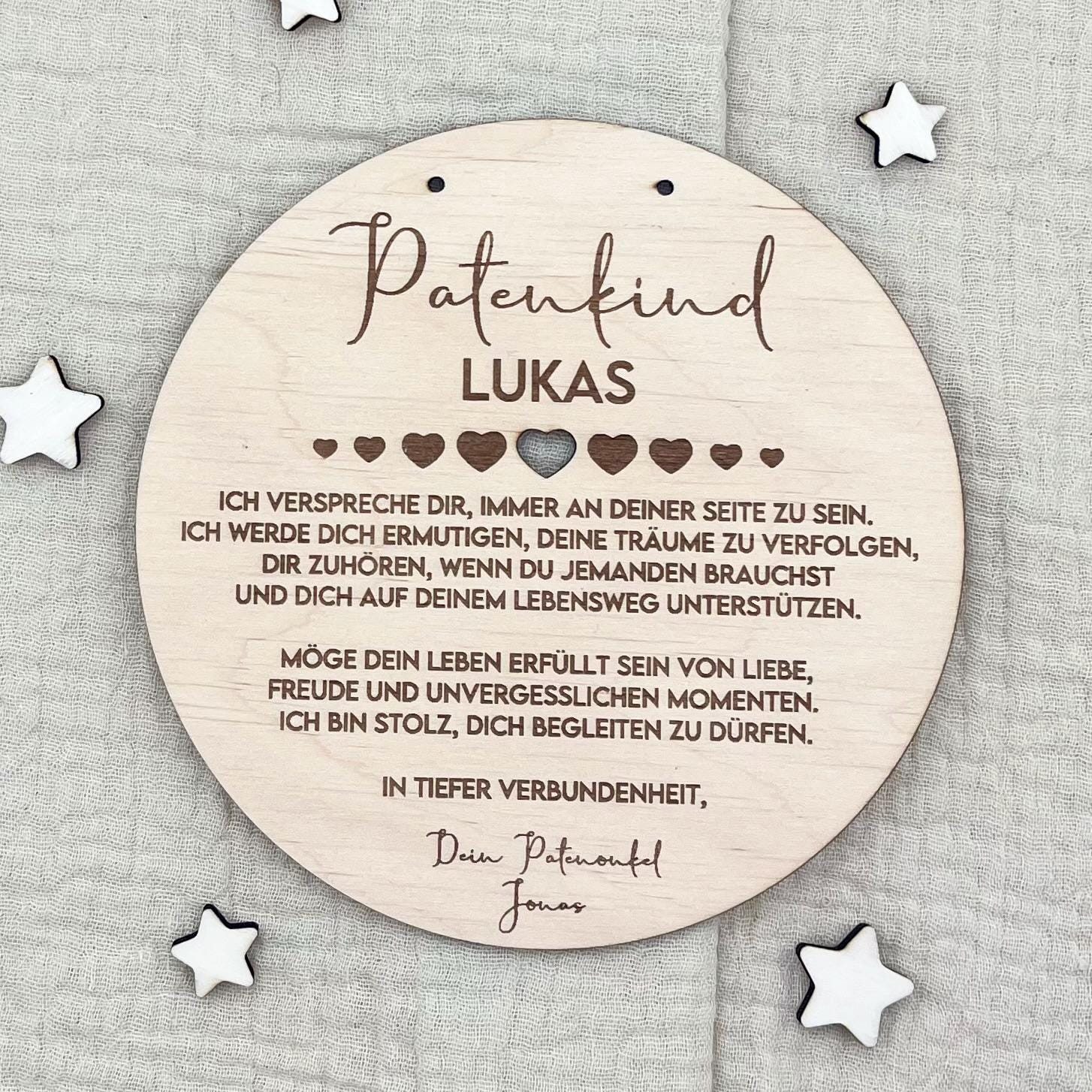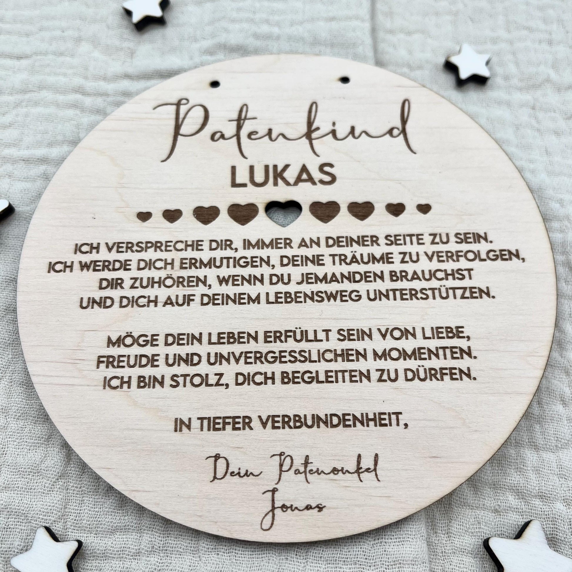 Taufgeschenk Patenkind Personalisiertes Holz Taufschild mit Name, Datum & Spruch von Patentante und Patenonkel