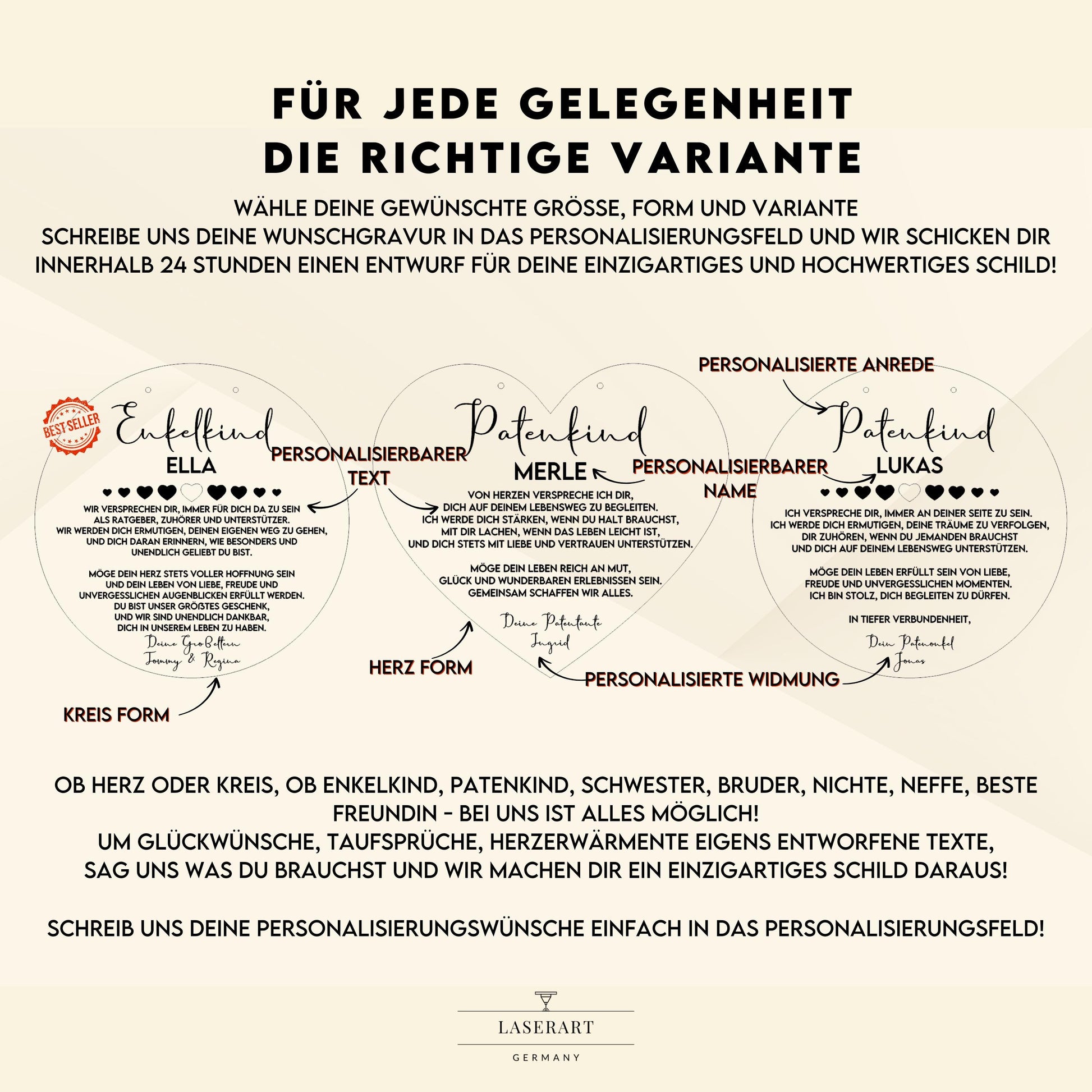 Ein hochwertiges, personalisiertes Taufschild, das Liebe, Erinnerung und Verbundenheit symbolisiert – ideal als Geschenk von Patentante oder Patenonkel für ihr Patenkind oder als bleibende Dekoration im Kinderzimmer.