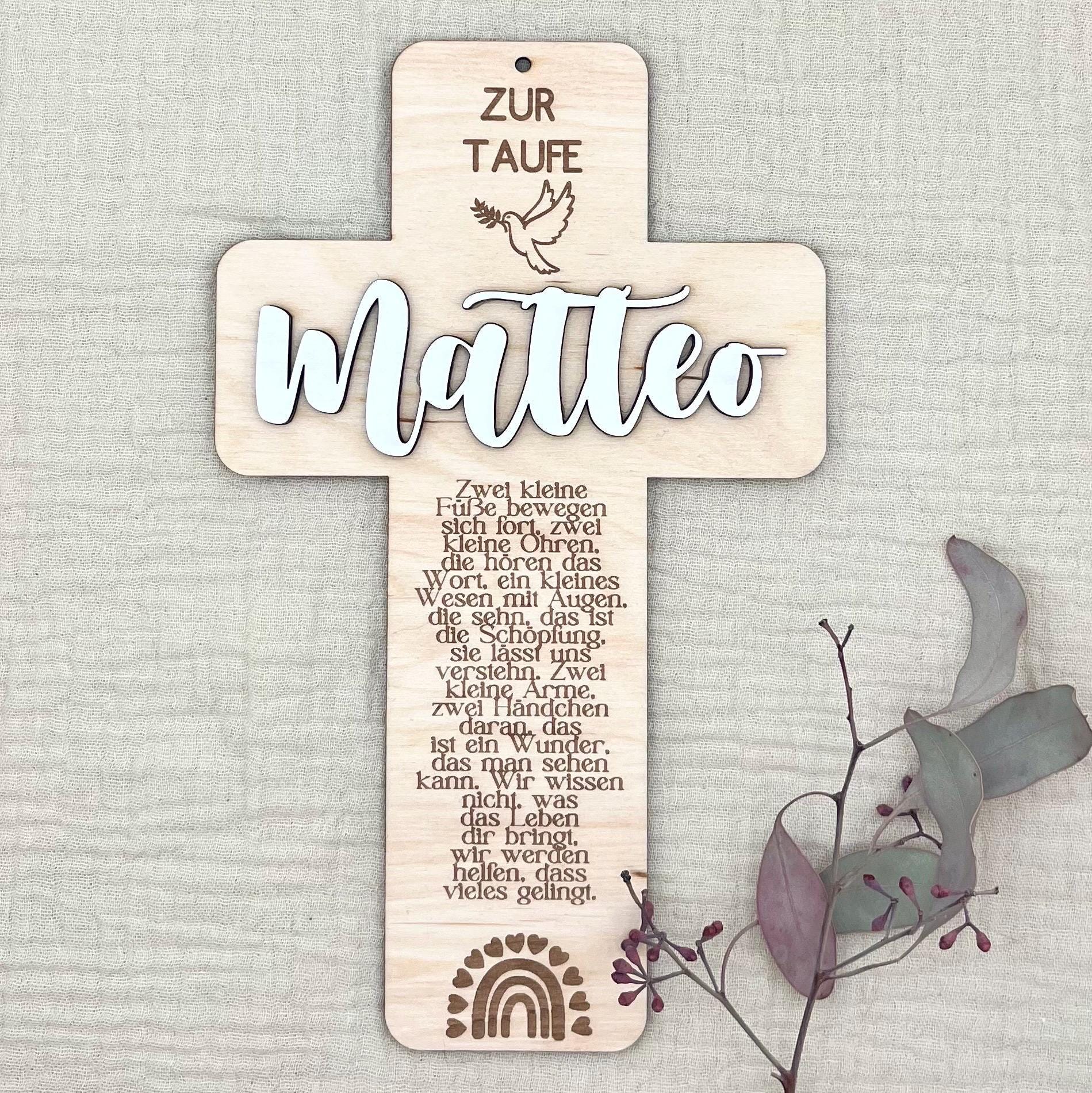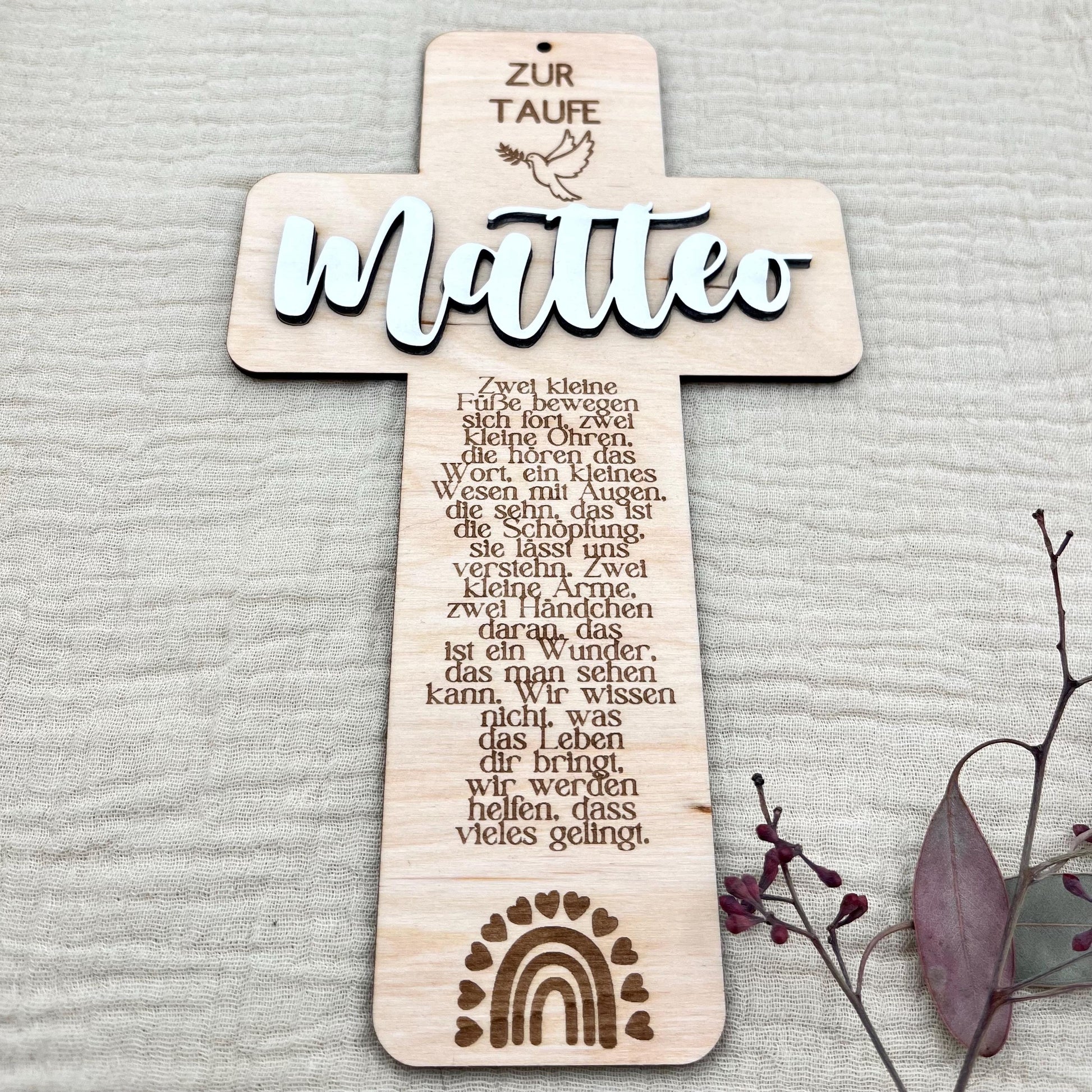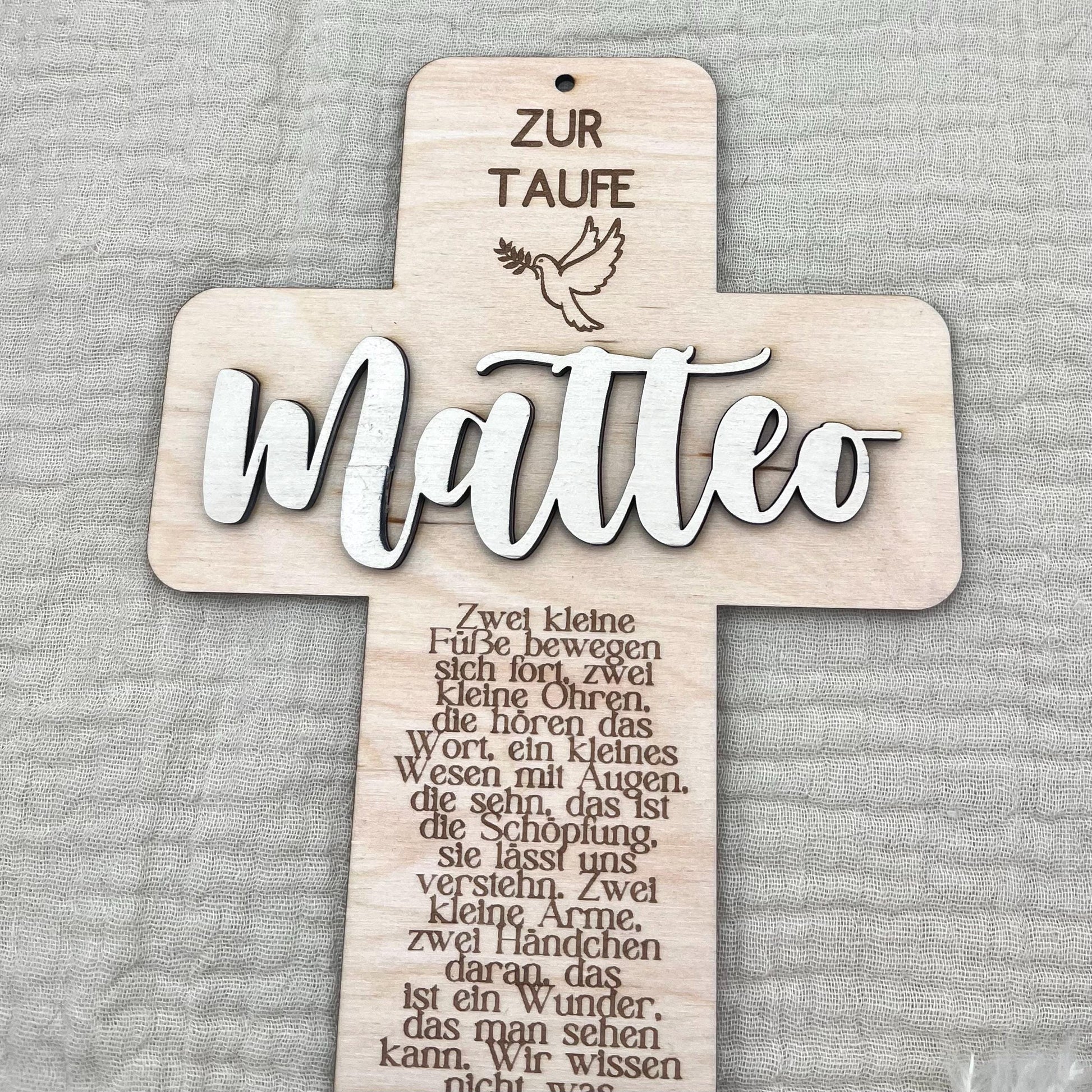 Unser handgefertigtes Taufkreuz aus FSC-Birkenholz wird mit Vorname, Taufdatum und Taufspruch graviert und mit farbigem 3D-Schriftzug versehen. Ein Geschenk, das Glauben und Erinnerung verbindet.