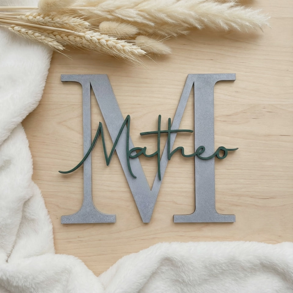 • Design: Anfangsbuchstabe im Hintergrund + Name im Vordergrund (3D-Optik)