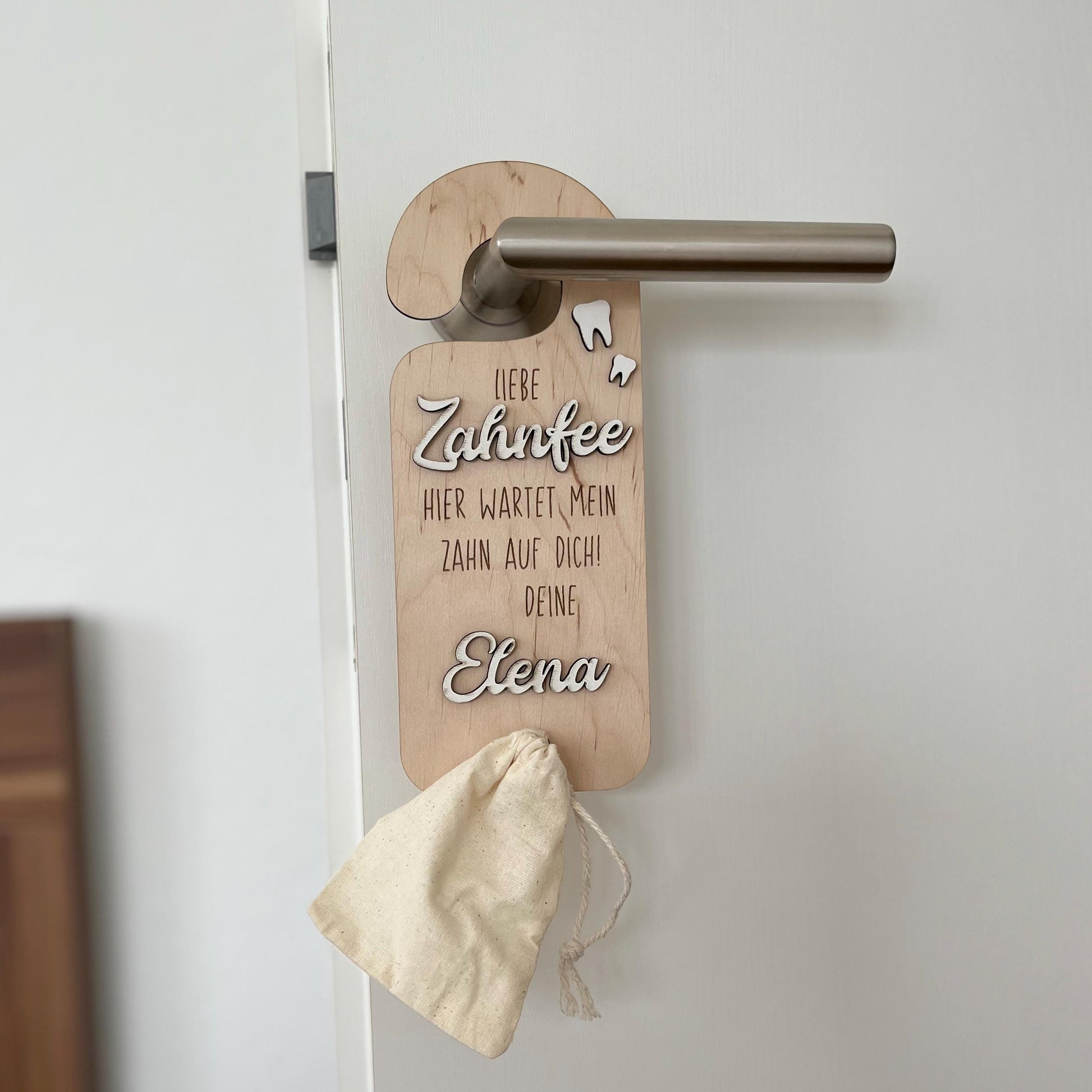 Ein liebevoll gestalteter Zahnfee Türhänger aus Birkenholz mit 3D-Schriftzug, Symbolen und Aufbewahrungsbeutel. Perfekt als Geschenk für Kinder und Erinnerung an den ersten Zahnverlust.