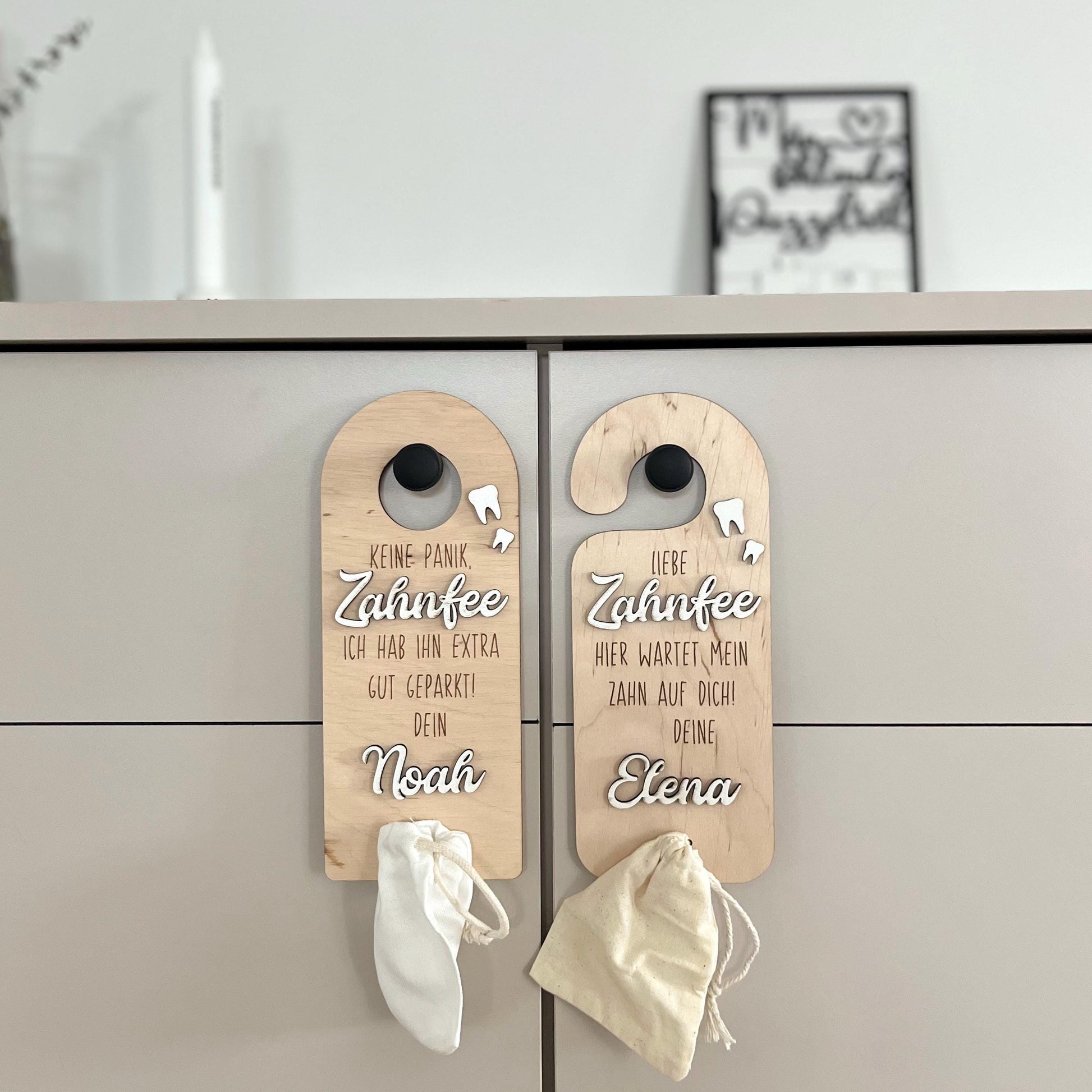 Zahnfee Türhänger Holz personalisiert Geschenk Wackelzahn & Milchzahn Aufbewahrung, Kinderzimmer Deko mit 3D Name und Beutel